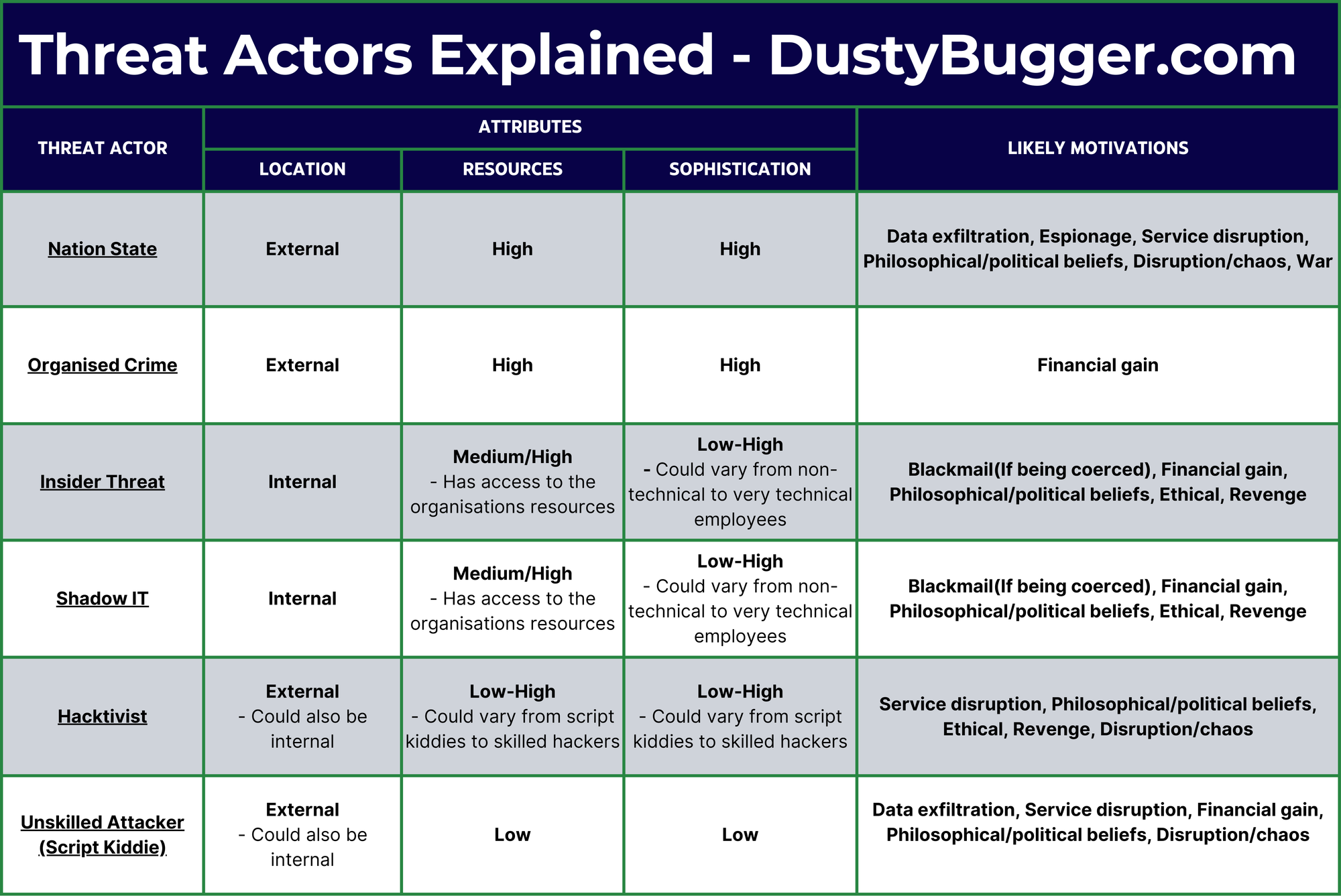 As you can see, threat actors can come in many form with varying attributes. By recognising these types, attributes, and motivations, youβll be better prepared to defend your systems, tailor your response plans, and ultimately stay ahead of their next move.