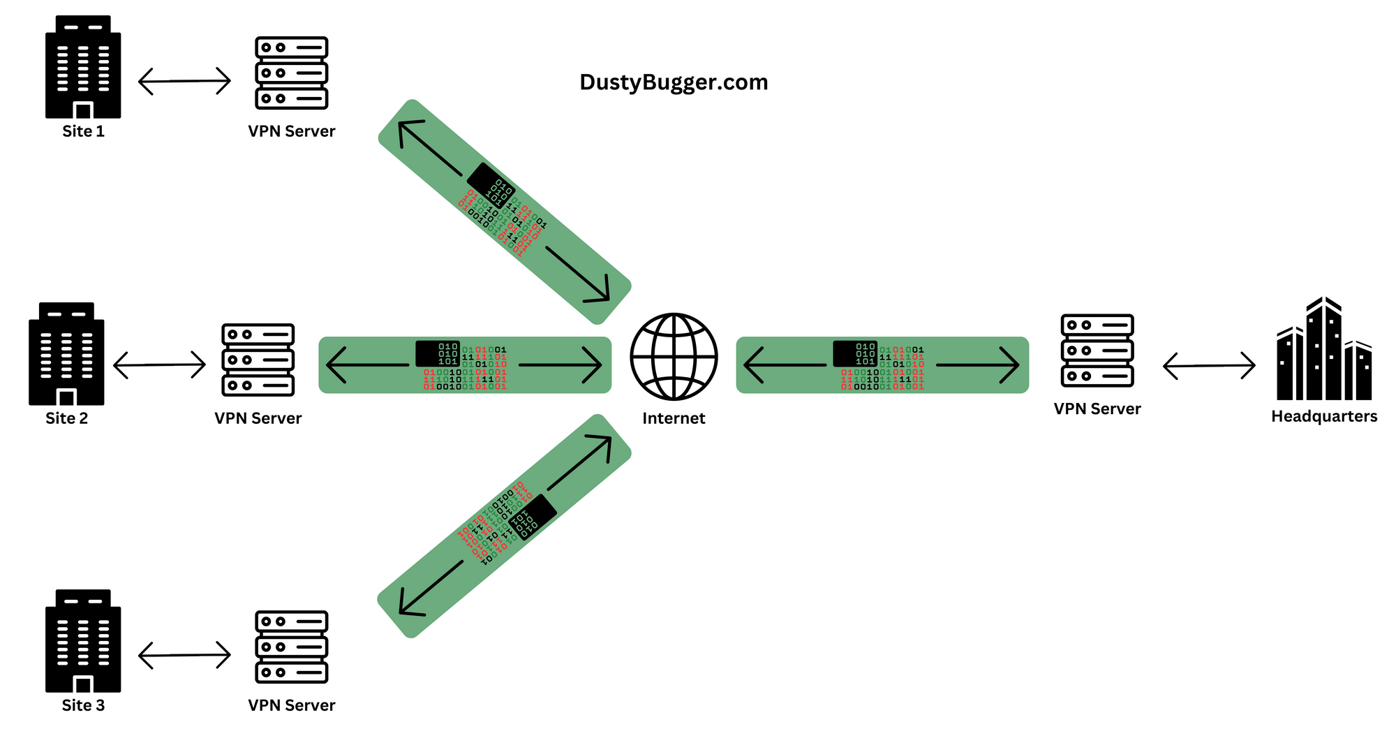 In this model there is a VPN gateway/server at each location that is setup to send and receive to and from gateways at other locations. Before any data leaves each site, it passes through the gateway which uses a VPN protocol such as IPsec to encrypt the traffic, which is then only decrypted at the destination gateway.