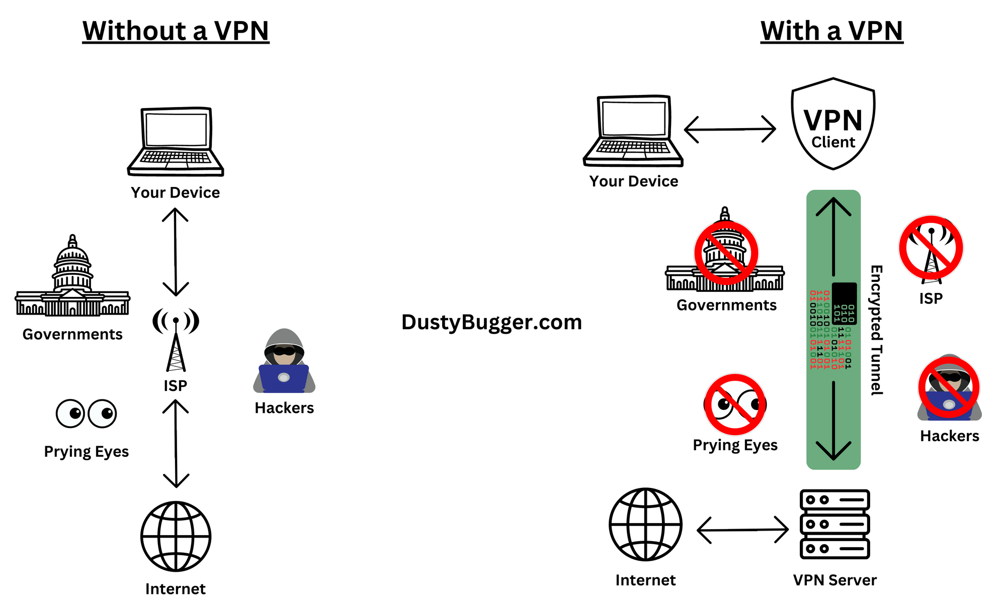 Usually when you access the internet your traffic gets sent unencrypted from your device to your Internet Service Provider(ISP) who routes it to the destination across the internet. This exposes your personal home IP address and the destination address and a bunch of other data not only to your ISP, but to the sites you visit or any other prying eyes such as governments or hackers.