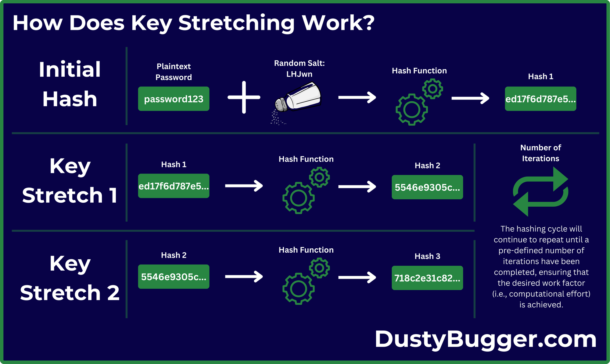 In a previous post, we covered the basic concepts of Hashing & Salting. Key stretching essentially repeats this process multiple times on the same piece of data(a "key").